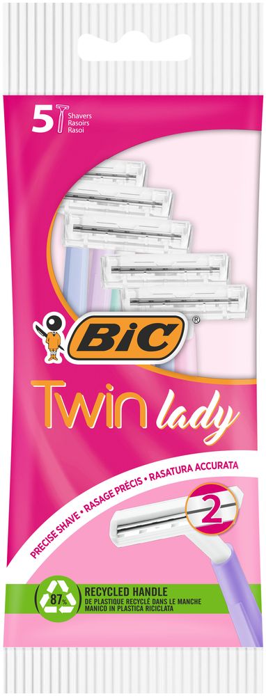 Kaheteraline õrnatoimeline ühekordne raseerija Twin Lady. Pakis 5 tk, õrnad pastelsed toonid.