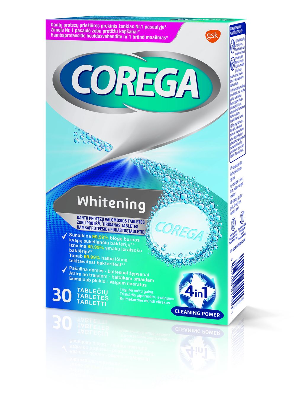 1. Lisage üks Corega tablett piisavale kogusele piisavalt soojale (mitte kuumale) veele, et see kataks proteesid (osalised proteesid või eemaldatavad sillad). 2. Pärast 3minutilist leotamist puhastage proteesid lahusega, kasutades pehmet hambaharja. 3. Loputage proteese hoolikalt voolava vee all. Hävitage allesjäänud lahus kohe pärast kasutamist.