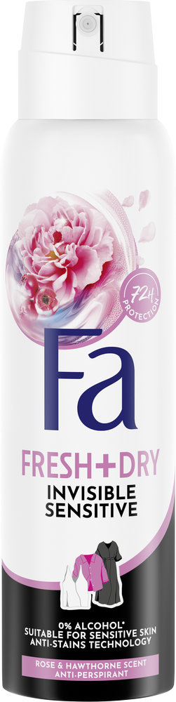 Fa Invisible_x000D_ Sensitive antiperspirant AntiStains tehnoloogiaga tagab õrna deokaitse kuni 48 h. Sobib ka tundlikule nahale._x000D_ Dermatoloogiliselt testitud. Värskendava lõhnaga. Enne kasutamist loksuta põhjalikult. Pihustades hoia pudelit_x000D_ püstiasendis, kaenlaalustest 15 cm kaugusel.