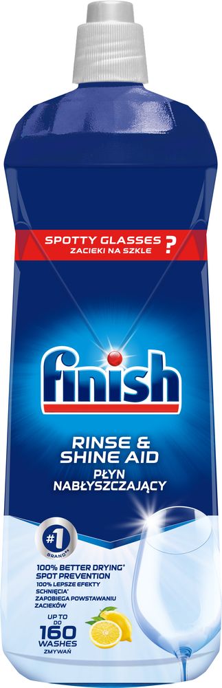 Finish loputusvahendil on 5 tõhusat toimeainet ja klaasikaitse koostiosa* säravamate ja kuivemate** nõude saamiseks. See viiekordne toime loputab sette, kiirendab kuivamist, võitleb veeplekkidega, annab kaitse ja tagab hiilgava sära. (*Kaitseb klaasi korrosiooni vastu, kui kasutada koos Finish Shine and Protect Detergents**versus ainult pesuvahend).