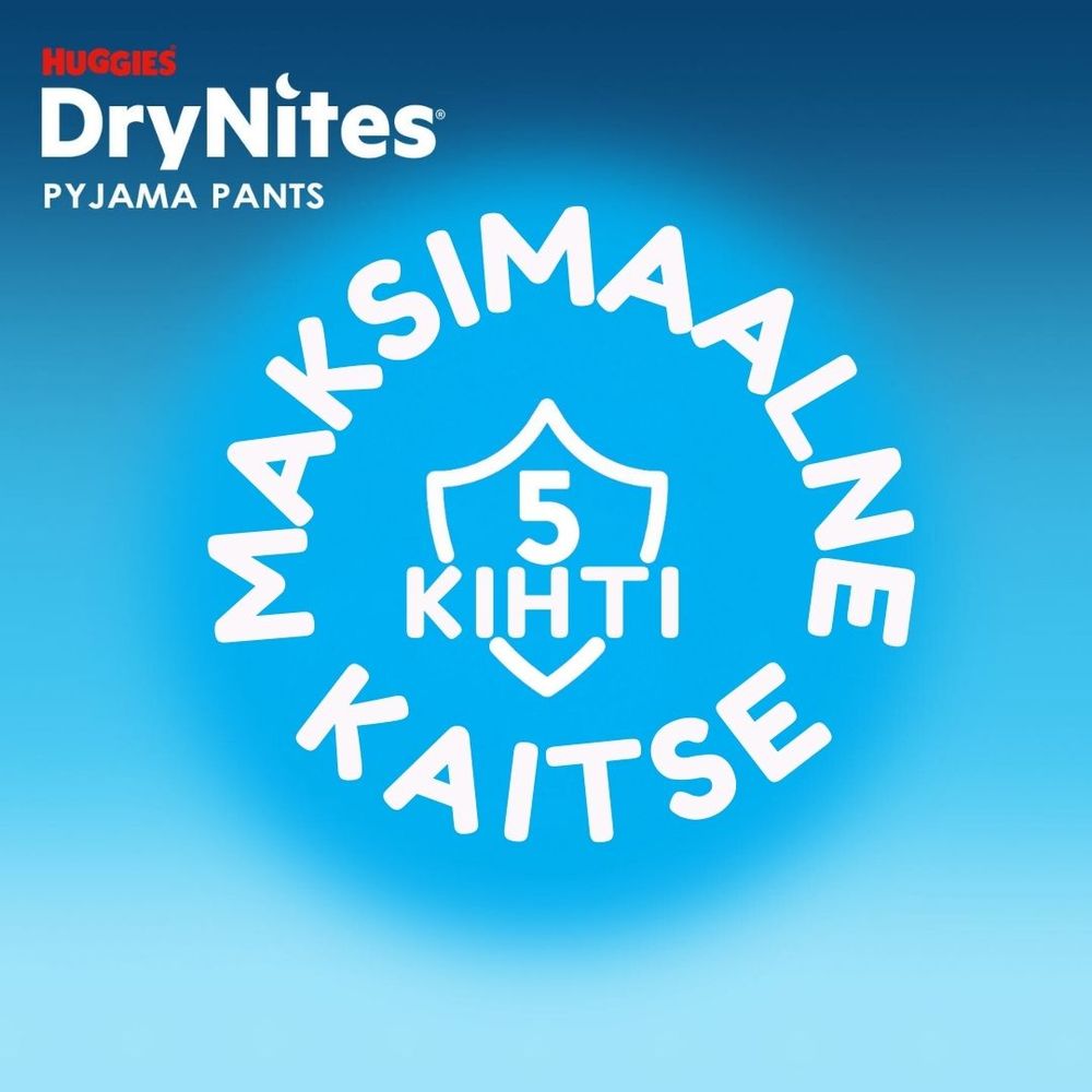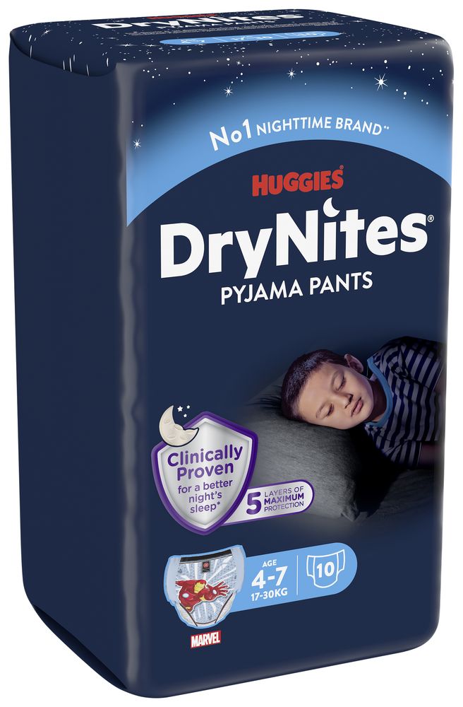 DryNites® pidžaamapüksmähkmed on mõeldud enureesiga lapsele, et aidata neil voodimärgamise probleemiga paremini hakkama saada. Enamik lapsi kasvavad sellest välja loomulikul teel, kuid mõne lapse jaoks võtab see lihtsalt pisut kauem aega. 5-kihilised mähkmed on valmistatud diskreetsetest, pehmetest ja erilistest materjalidest, mistõttu on nad õhemad kui tavalised mähkmed ning riiete all märkamatud. Mähkme vettpidav väliskiht, ülivenivad küljekinnitused, aluspükstele sarnanev disain - kõik see võimaldab lapsel tunda end sama mugavalt kui puuvillastes aluspükstes. Laps saab rahulikult magada ning Teil on muretu öö, teades, et voodipesu ja pidžaamad jäävad kuivaks. Tänu DryNites® pidžaamapüksmähkmetele ärkavad lapsed kuivana ja muretult, et olla valmis tegema seda, mida nad kõige paremini oskavad - olla lapsed! Sobivad 4-7 aastasele poistele, kelle kehakaal on vahemikus 17-30kg