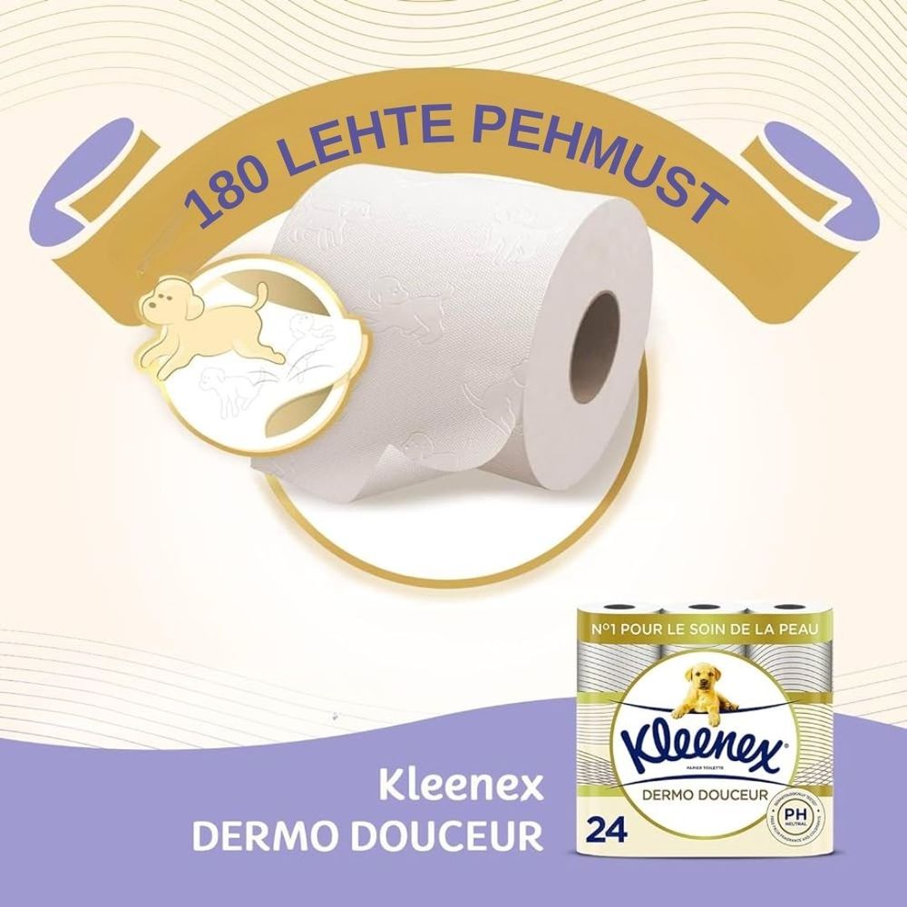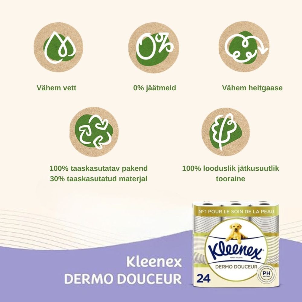 Kleenex ® Dermo Douceur 3-kihiline tualettpaber tagab teile suurepärase hoolitsuse. Dermatolooogiliselt testitud, värvi ja lõhnaaine vaba PH neutraalne tualettpaber ei ärrita nahka. Igal lehel on unikaalne 3D laine tekstuur, mis tagab puhtama tulemuse vähemate lehtede arvuga. Tänu oma eriti pehmetele 100% looduslikele kiududele on Kleenex® Dermo Douceur pehmuses number 1 ning pakub teile õrna puhastust ja hoolitseb teie naha eest. Pakendis on 18 maksi rulli. 100% taaskasutatav pakend on valmistatud 30% taaskasutatud pakendist.