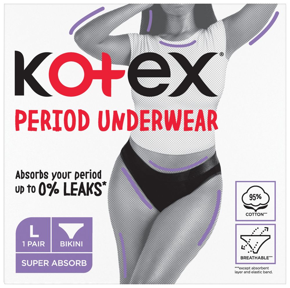Kotex®Period menstruatsiooniaegne aluspesu: ülimalt imavad, hingavad, bikiinipüksid, mis aitavad Teil tunda end mugavalt ja enesekindlalt. See on meie korduvkasutatav alternatiiv ühekordsetele intiimhügieeni toodetele, mis imab lekkekindlalt vedelikku sama palju kui ööside. Mugav, tõeliselt puuvillane aluspesu hoiab Sind kaitstuna kogu päeva! Pakendis on 1 paar korduvkasutatavaid aluspükse, millede soovitatav kasutusaeg on kuni 50 pesukorda. Hooldusjuhis: peske enne kandmist, peale kasutamist teostage õrn masinpesu kuni 30C veega sarnase värvusega riietega või käsipesu jaheda veega, seejärel pange kuivama. Ärge kasutage pesuvalgendit ega loputusvahendit. Mitte triikida. Suurus L sobib kui puusaümermõõt on 98-104cm.