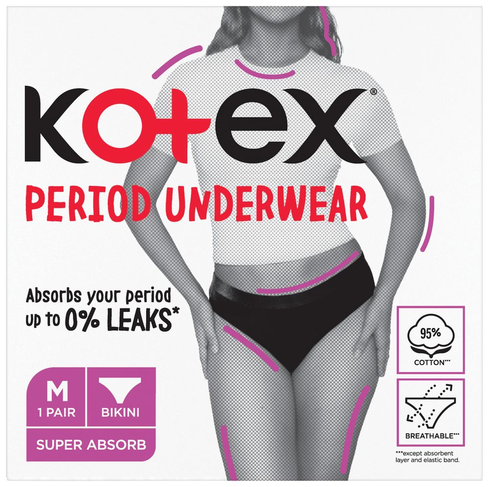 Kotex®Period menstruatsiooniaegne aluspesu: ülimalt imavad, hingavad, bikiinipüksid, mis aitavad Teil tunda end mugavalt ja enesekindlalt. See on meie korduvkasutatav alternatiiv ühekordsetele intiimhügieeni toodetele, mis imab lekkekindlalt vedelikku sama palju kui ööside. Mugav, tõeliselt puuvillane aluspesu hoiab Sind kaitstuna kogu päeva! Pakendis on 1 paar korduvkasutatavaid aluspükse, millede soovitatav kasutusaeg on kuni 50 pesukorda. Hooldusjuhis: peske enne kandmist, peale kasutamist teostage õrn masinpesu kuni 30C veega sarnase värvusega riietega või käsipesu jaheda veega, seejärel pange kuivama. Ärge kasutage pesuvalgendit ega loputusvahendit. Mitte triikida. Suurus M sobib kui puusaümermõõt on 90-97cm.