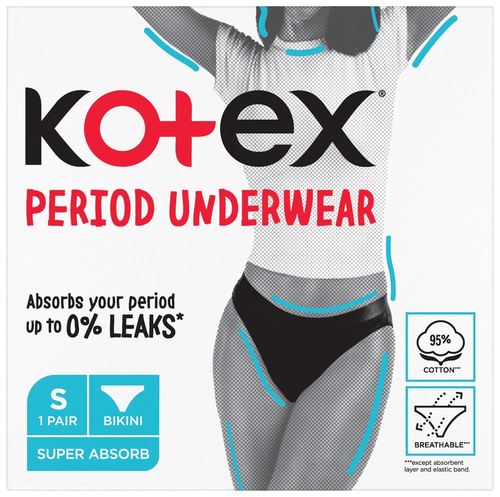 Kotex®Period menstruatsiooniaegne aluspesu: ülimalt imavad, hingavad, bikiinipüksid, mis aitavad Teil tunda end mugavalt ja enesekindlalt. See on meie korduvkasutatav alternatiiv ühekordsetele intiimhügieeni toodetele, mis imab lekkekindlalt vedelikku sama palju kui ööside. Mugav, tõeliselt puuvillane aluspesu hoiab Sind kaitstuna kogu päeva! Pakendis on 1 paar korduvkasutatavaid aluspükse, millede soovitatav kasutusaeg on kuni 50 pesukorda. Hooldusjuhis: peske enne kandmist, peale kasutamist teostage õrn masinpesu kuni 30C veega sarnase värvusega riietega või käsipesu jaheda veega, seejärel pange kuivama. Ärge kasutage pesuvalgendit ega loputusvahendit. Mitte triikida. Suurus S sobib kui puusaümermõõt on 84-89cm.