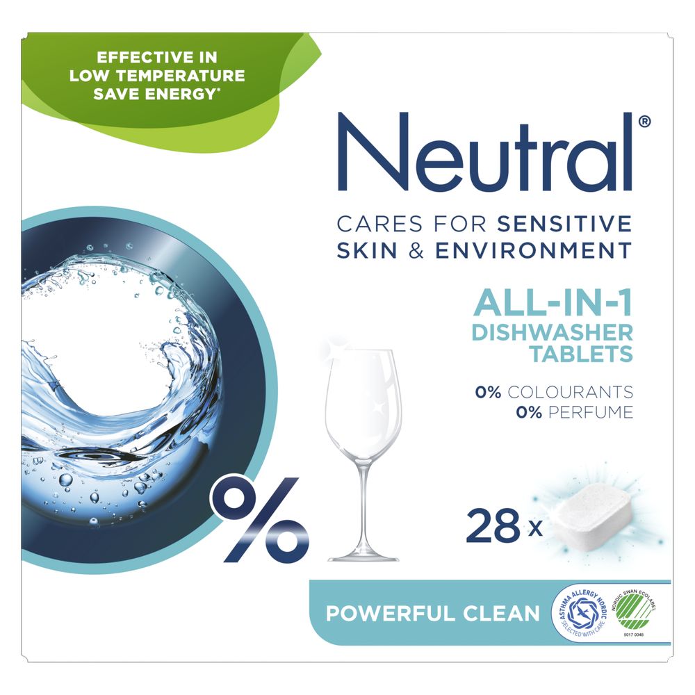 Neutral nõudepesumasinatabletid All-in-One toimivad hästi madalatel temperatuuridel (45°C). All-in-One nõudepesumasinatabletid tagavad täieliku puhastuse.