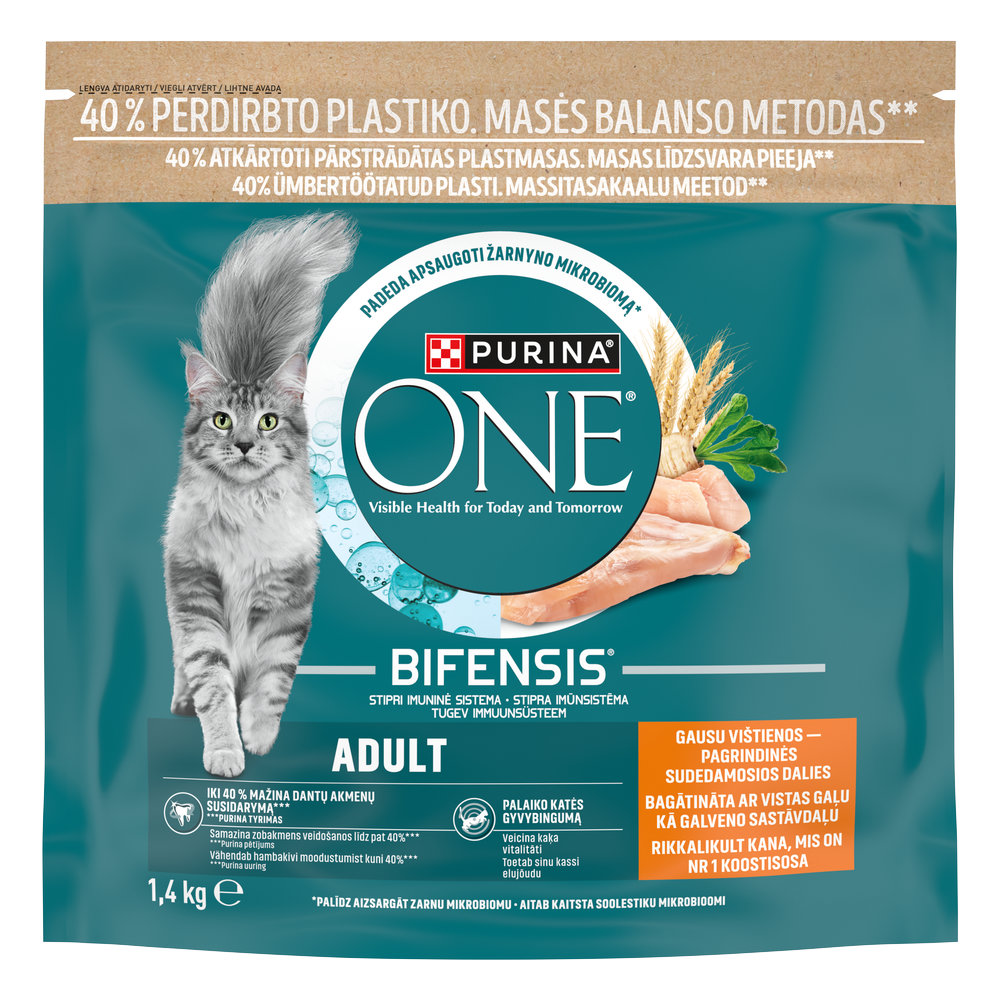 SILMNÄHTAVALT TERVE NII TÄNA KUI KA HOMME PURINA ONE® BIFENSIS® Adult on täiskasvanud, üle 1-aastase kassi vajadustele kohandatud toit Tasakaalus soolestiku mikrobioom on sinu kassi tervisele ülioluline. See mõjutab otseselt tema immuunsüsteemi. Mikrobioom on triljonitest soolestikus elavatest mikroorganismidest koosnev ökosüsteem, mis on igal kassil ainulaadne. Mikroorganismide tasakaal mõjutab positiivselt nii sinu kassi seede- ja immuunsüsteemi tervist kui ka tema üldist heaolu. PURINA ONE BIFENSIS® on kasulike funktsionaalsete bakteritega (Lactobacillus) toit, mis tõestatult tugevdab kassi immuunsüsteemi seestpoolt ja aitab kaitsta soolestiku mikrobioomi tervist. ONE BIFENSIS® sisaldab kvaliteetseid koostisosi, mille hulgas on ka prebiootilise toimega sigur, mis toidab soolestikus olevaid kasulikke baktereid, toetades nii sinu kassi soolestiku mikrobioomi ning aidates teda tervena hoida. Tugev seede- ja immuunsüsteem ning läikiv karv – näed oma kassi tervises silmnähtavaid muutusi nii täna kui ka homme. ´- Toetab soolestiku mikrobioomi tasakaalu tänu prebiootilise toimega sigurile - Kana nr 1 koostisosana on hea valgu- ja aminohapete allikas, mis aitab kasvatada ja säilitada tugevaid lihaseid - Oomega-3- ja -6-rasvhapped ning asendamatud vitamiinid ja mineraalained aitavad hoida naha tervena ja karvkatte säravana - Aitab säilitada tugevaid ja tervislikke luid tänu mineraalidele ja D-vitamiinile - Vähendab hambakivi kogunemist kuni 40%* - Kõikide vajalike vitamiinide ja mineraalidega, mis aitavad säilitada sinu kassi elujõudu *vastavalt Purina uuringutele