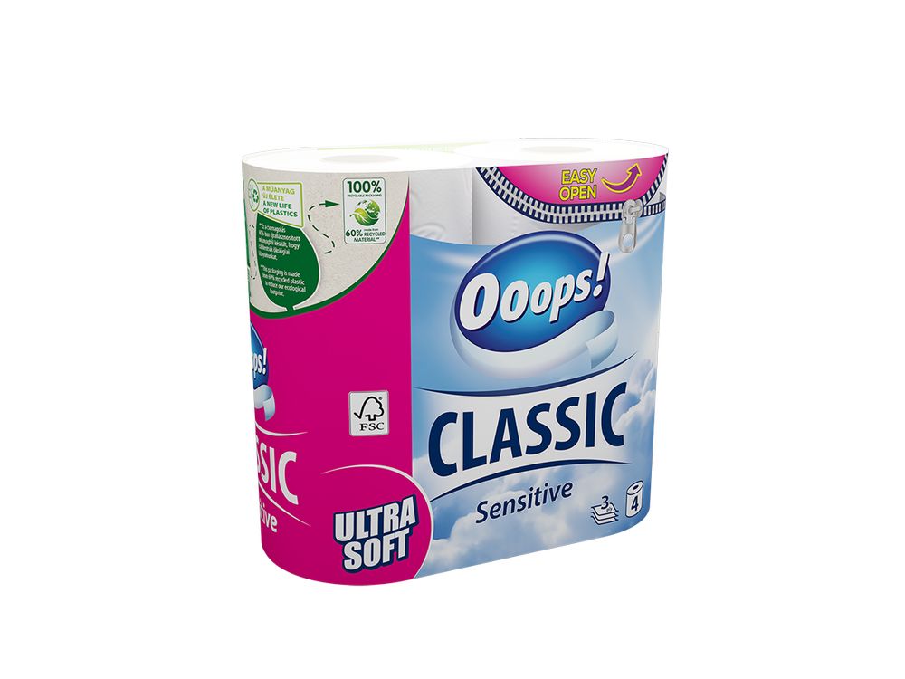 Ooops! Classic Sensitive pehme 3 kihiline valget värvi lõhnatu tualettpaber. Rullis 145 lehte.