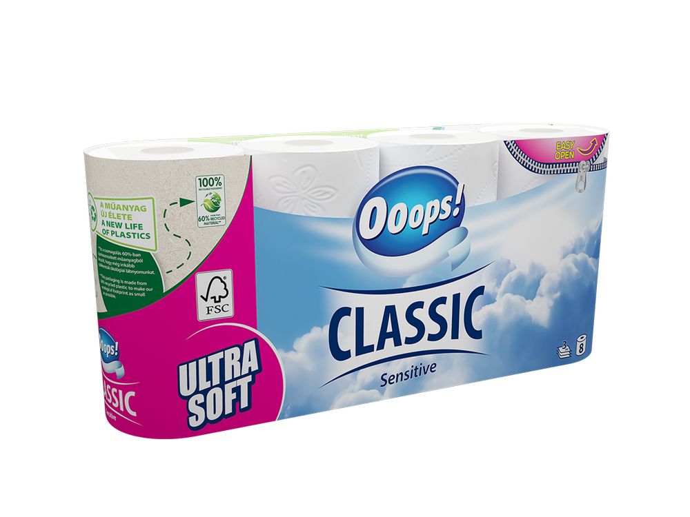 Ooops! Classic Sensitive pehme 3 kihiline valget värvi lõhnatu tualettpaber. Rullis 145 lehte.