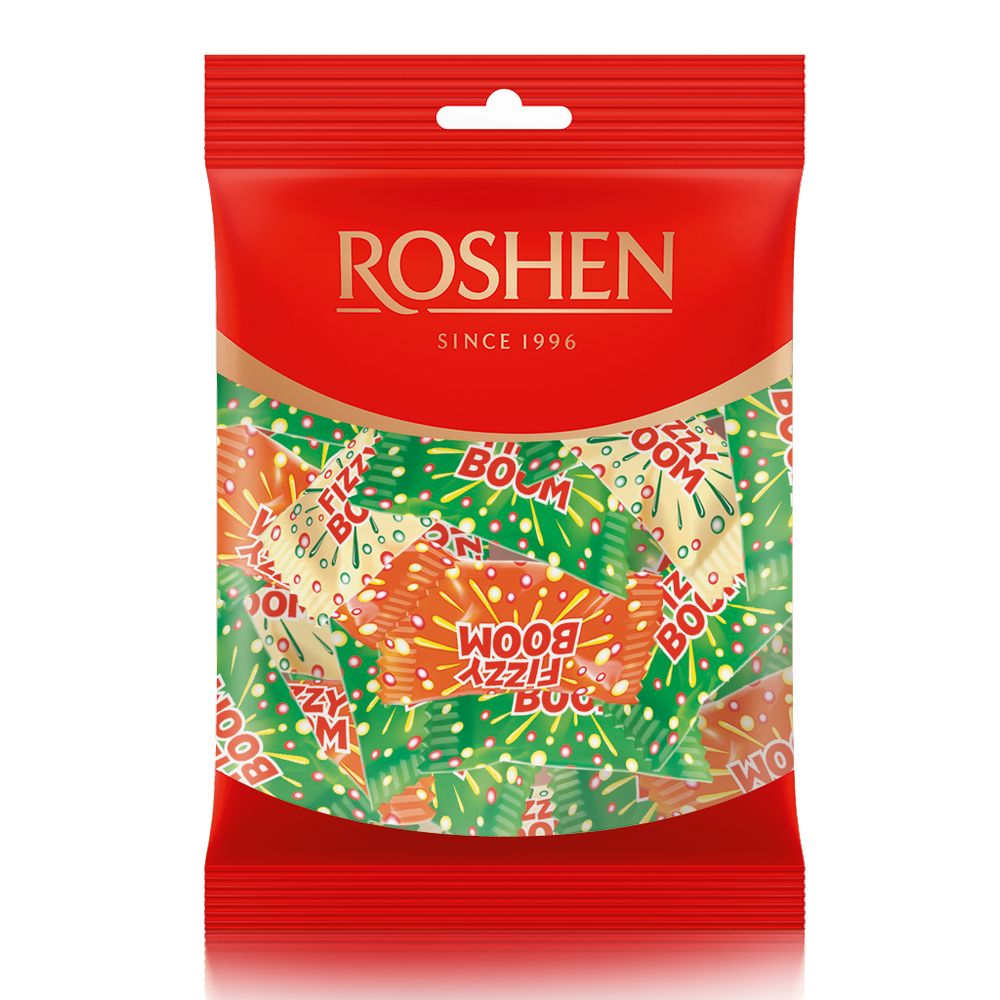 KARAMELL KUIVA TÄIDISEGA (8%) FIZZY BOOM. Kompvekisegus on apelsini-, koola- ja sidrunimaitseliste -laimi täidistega karamellid