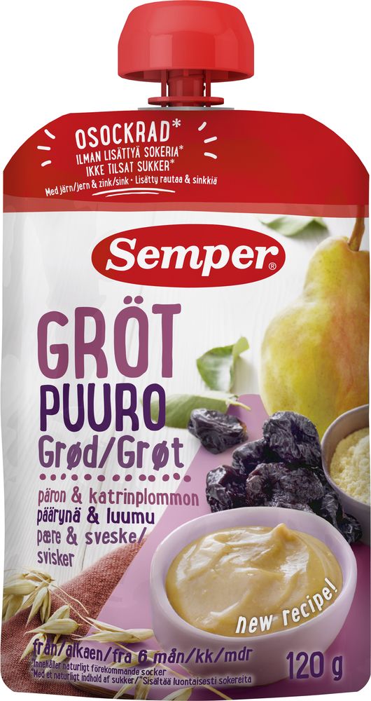 Semper kaerapuder pirni ja ploomiga, alates 6. elukuust. Ilma lisatud suhkruta, täiustatud vitamiinide ja mineraalidega.