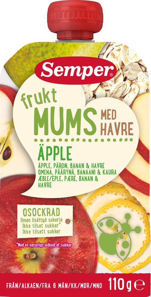 Semper Fruktmums Apple & Oats on värske ja maitsev puuviljapüree, valmistatud õunast, pirnist, banaanist ja kaerahelvestest. Sobib suupisteks või magustoiduks lastele alates 6. elukuust. Mugav pakend on hea vahepala reisil või kodus nautimiseks.