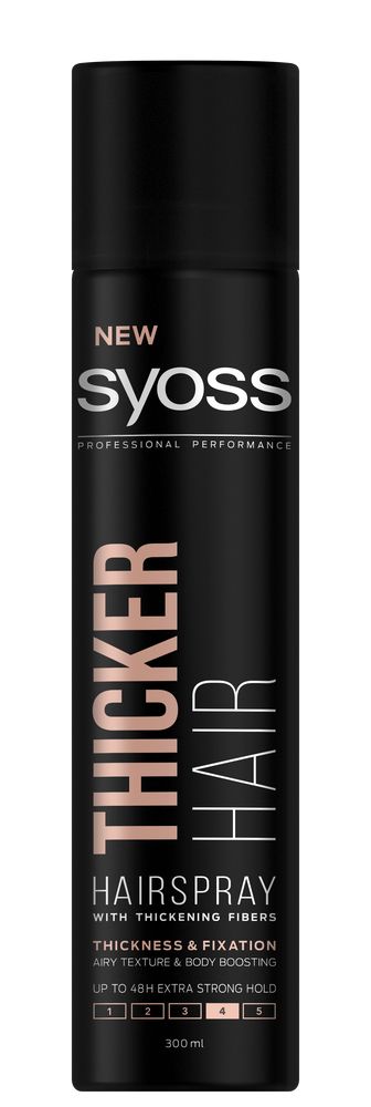 SYOSS PROFESSIONAALNE TEOSTUS. Juuksurite poolt välja töötatud ja salongitoodetest_x000D_ inspireeritud SYOSSi tootesari THICKER HAIR muudab sinu juuksed tihedamaks ja soengud_x000D_ kohevamaks. TIHENDAVATE KIUDUDEGA THICKER HAIR JUUKSELAKK. Kuni 48h eriti tugev_x000D_ püsivus. Kerge tekstuur ja kohevus. Parimate tulemuste saamiseks kasuta koos SYOSS THICKER_x000D_ HAIR juuksevahu ja fiiberspreiga. Enne kasutamist loksuta korralikult. Pihusta kuivadele juustele_x000D_ 30 cm kauguselt. Kui otsik ummistub, loputa seda sooja veega.