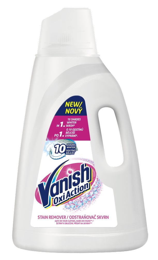 TAASTAB VALGE VÄRVI* + PLEKID KADUNUD^ ISEGI KIIRE PESUTSÜKLIGA**. HALLIVASTANE TEHNOLOOGIA. KLOORIVABA VALGENDI JA PLEKIEEMALDI. 50% rohkem hapniku jõudu***. MITMEKORDSE TOIMEGA KONTSENTREERITUD GEEL***: eemaldab ohutult tugevad plekid; taastab valge värvi*; kaitseb hallikaks muutumise eest; eemaldab ebameeldiva lõhna. *taastab hallide kangaste valge värvi. **60 min pesutsükkel. ***vs. eelmine Vanish geeli koostis samas läbipaistmatus pudelis. ^Tugevate plekkide puhul järgige eeltöötluse või leotamise juhiseid.