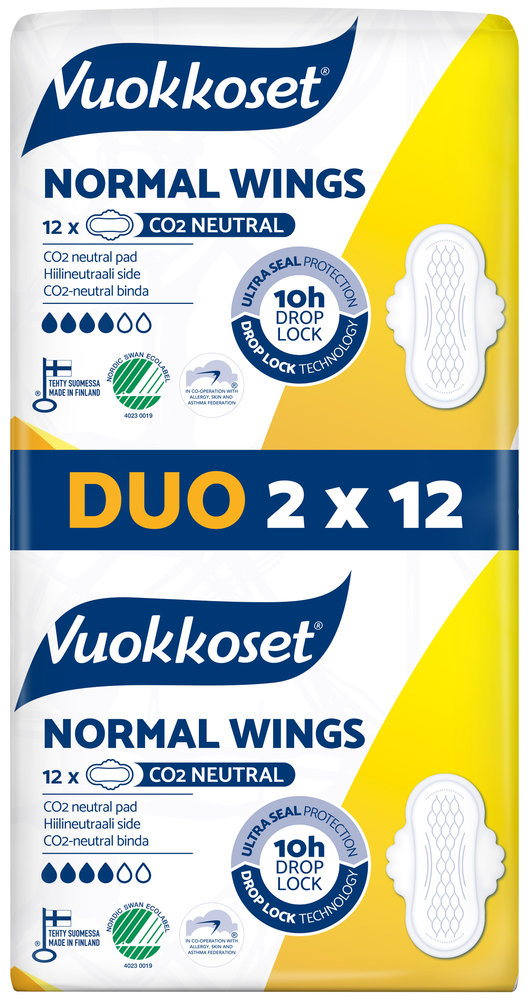 Vuokkoset Normal Wings on hingav õhuke pehme pealispinna ja tiibadega hügieeniside. Kitsamaks vormitud side sobitub hästi aluspükstesse, samal ajal kui tiivad hoiavad sideme kindlalt paigal ning hoiavad ära lekked. Sidemed on individuaalselt pakendatud